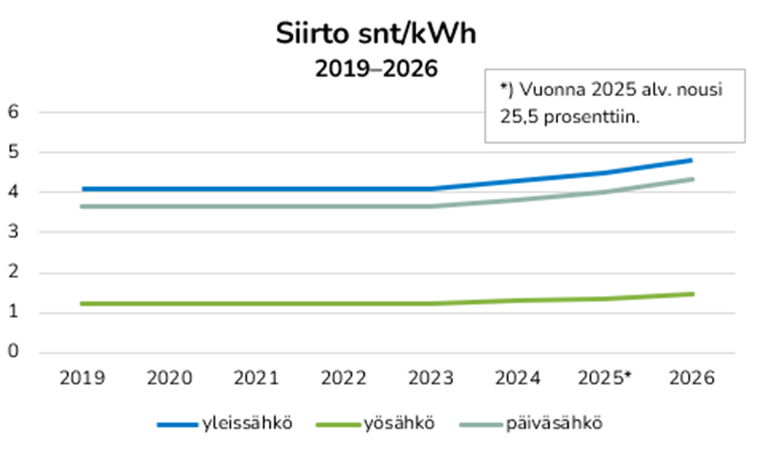 Kun kulutat sähköä, maksat sekä sen siirrosta (verkkopalvelumaksu) ja käyttämästäsi energiasta. Oma paikallinen sähköverkkoyhtiösi veloittaa sähkönsiirrosta verkkopalvelumaksun muodossa. Se sisältää energian siirtohinnan (snt/kWh), perusmaksun (€/kk), arvonlisäveron (25,5 %) sekä sähköveron (kuluttajilla n. 2,25 snt/kWh, arvonlisäverollisena n. 2,83 snt/kWh).